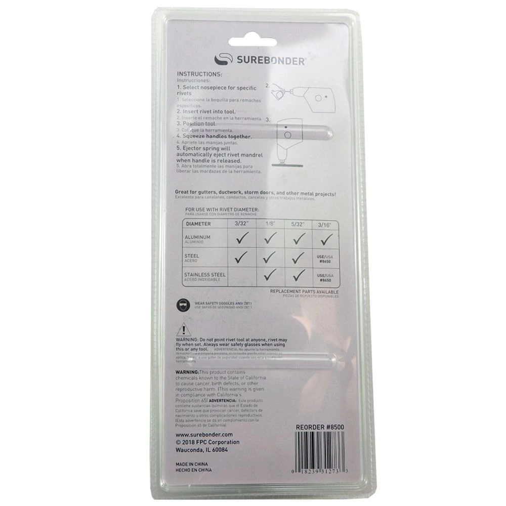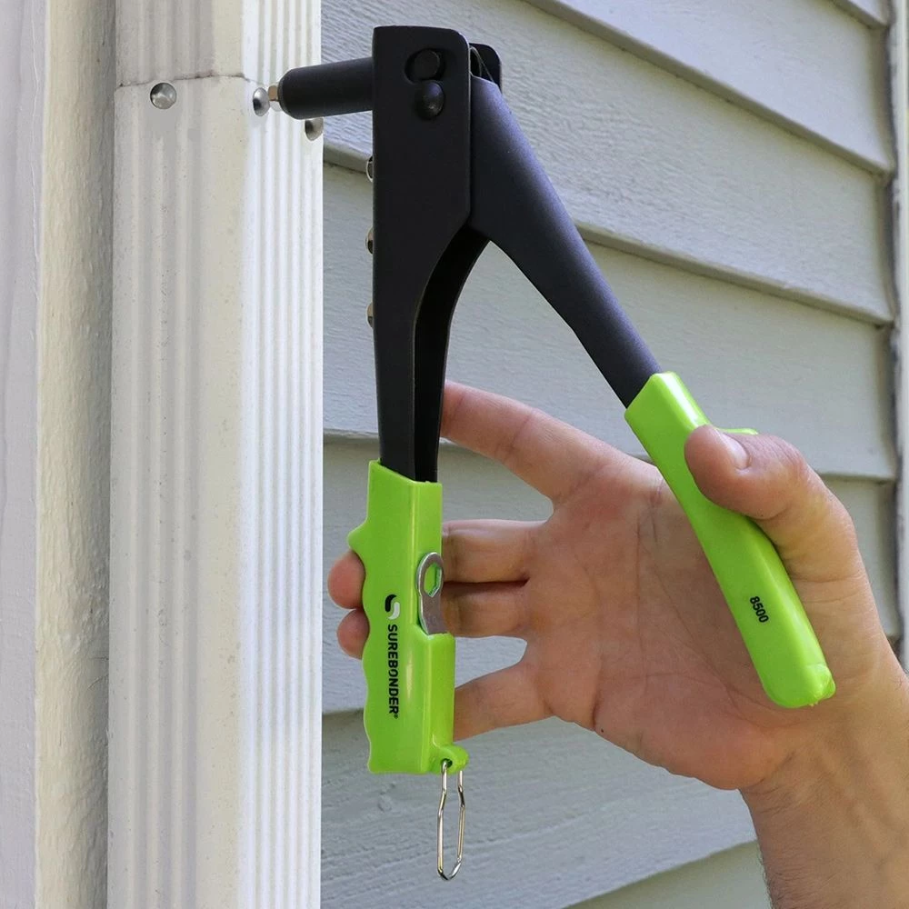 Surebonder Light Duty Rivet Tool is great for installing rivets into gutters, ductwork, storm doors and other metal projects. It features a slim nose to fit into tight places. The spring-loaded handle automatically releases rivet mandrel when released. It makes a great tool for homeowners.
