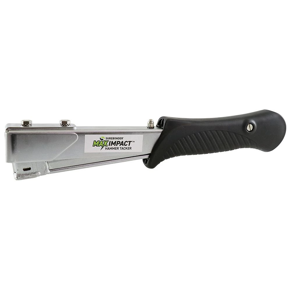 Surebonder Max Impact Heavy Duty Hammer Tacker Staple Gun features a cushioned non-slip grip. This hammer tacker has easy drop-in loading and a larger head providing less tear. You can load 180 staples. There is also a staple viewer.
