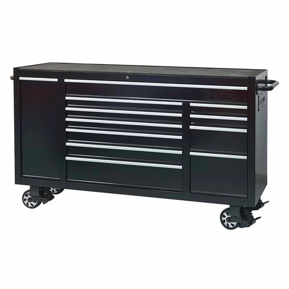 Store your things neatly in order with the TACTIX® 72 In. Tool cabinet with 12 Drawers. It features ideal sized drawers with each capable of both 100 lbs. and 200 lbs. It also has a power supply and a power tool locker to store and organize your cordless power tools and more. It can hold a total capacity of 3500 lbs. and has 31,600 cubic inches of storage. It is also a great workbench.