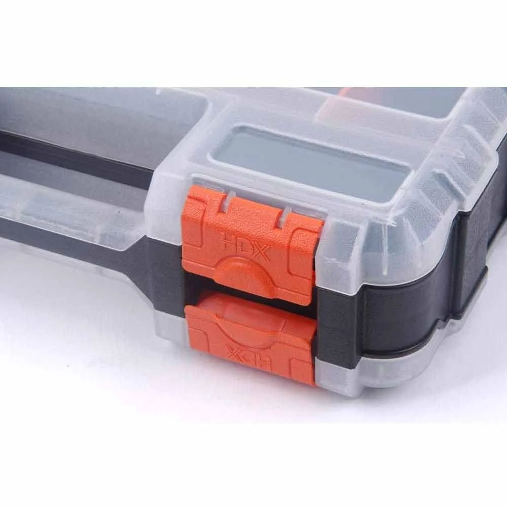 This TACTIX® 12-1/2 In. Double Sided Organizer has removable dividers and can be customized to perfectly suit your needs. Designed with 15 compartments on each side and sturdy structural construction, it’s perfect for organizing your small items, whether you’re using it in the shop or the house. The latch lock system keeps the organizer locked down when you need everything in its right place. You can bring this to more rugged jobsites thanks to the robust material making up this box. It can survive light impacts and drops without cracking or shattering. An ergonomic handle is conveniently located at the top, giving you full freedom to carry this around or keep it hung up on a pegboard with a couple of properly-lengthen fasteners supporting it.