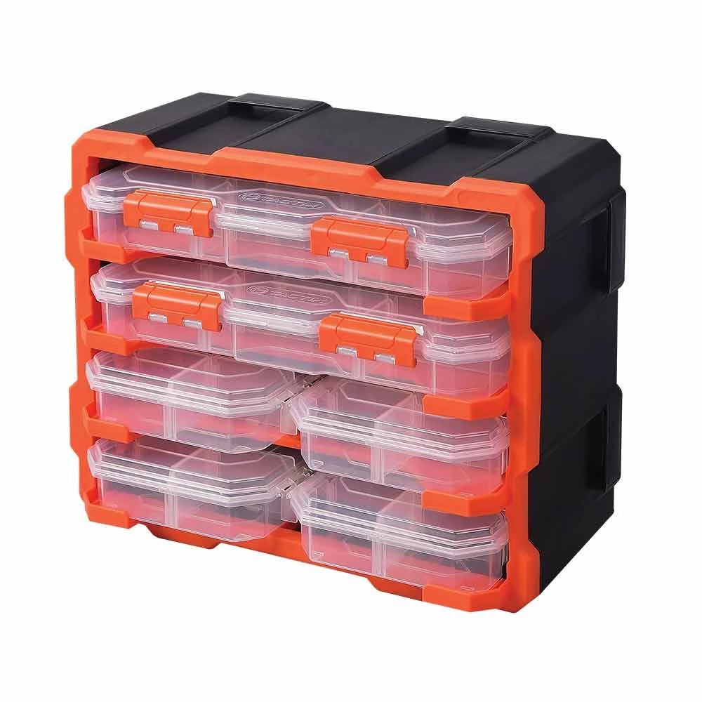 TACTIX® Plastic Rack with 6 Organizers is a rugged cabinet that includes storage boxes with removable dividers so you can create your own perfect organizer. Six parts boxes – four small and two large – help sort and store supplies for easy access. You'll always be able to locate tools, bolts, screws, tackle and crafting gear. The custom cabinet keeps everything in place. Designed to interlock, this storage tower stacks vertically or side by side, and can be wall-mounted. Whether you're organizing a garage, work shop or craft room, this tool chest makes the most of a busy space.