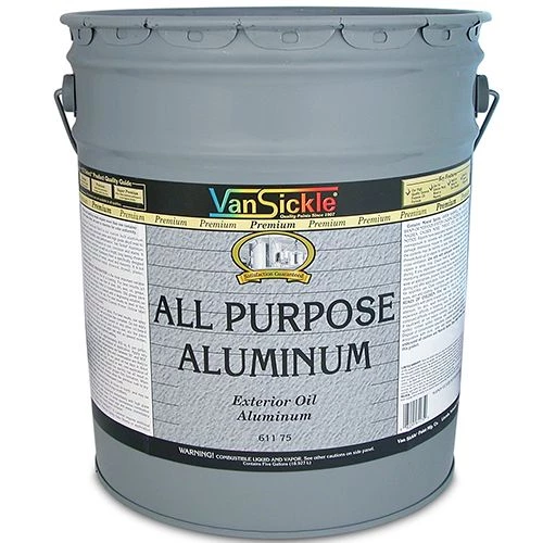 Van Sickle® All-Purpose Aluminum Exterior Oil Paint is a custom-built aluminum, formulated with quality aluminum paste and high-grade alkyd resin to provide superior durability and performance. When properly applied, it is intended to provide long term protective results. It is designed to give the appearance of a weathered galvanized/aluminum finish. It can be applied by natural bristle brush, roller or spray, do not thin, or add oils or any other paints to this product.
